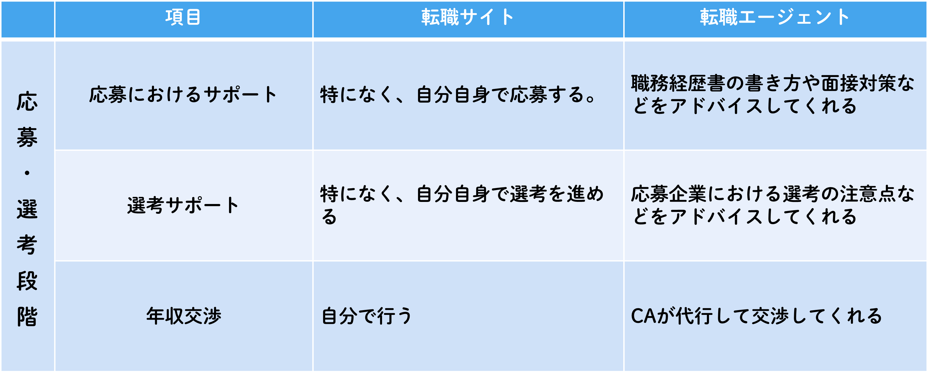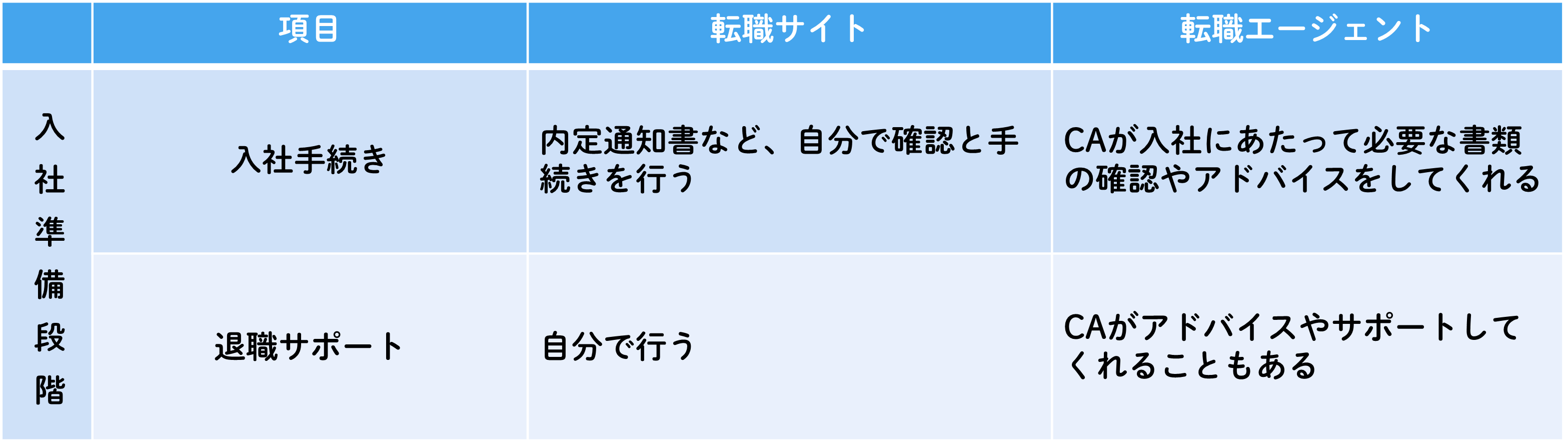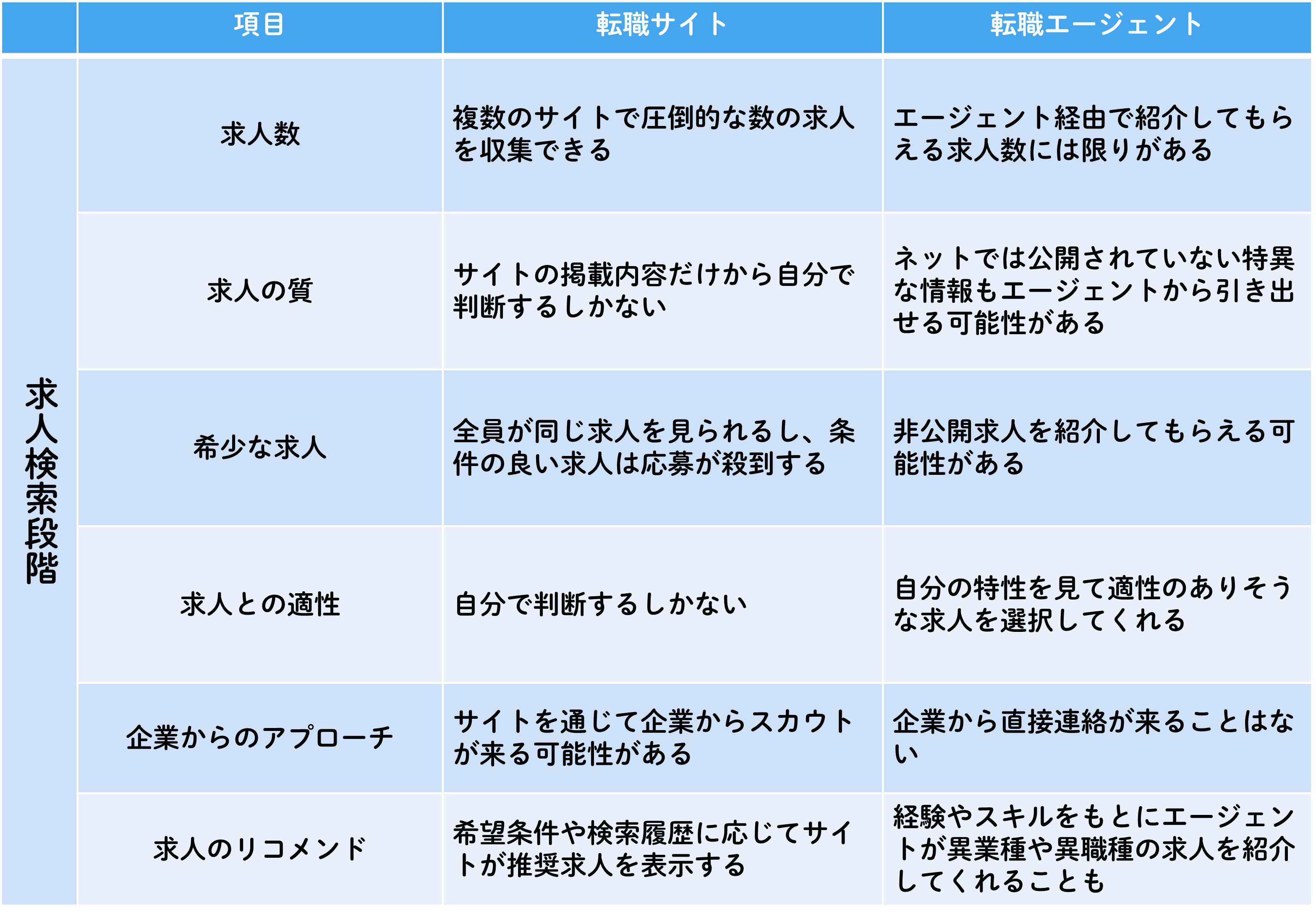 | 求職者に対する付加価値 | 求人や転職ノウハウなどの情報提供 | 求人の紹介、選考フォロー、入社までのサポート |