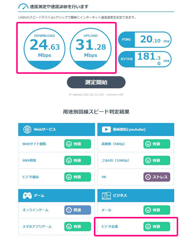 利用環境に適しているか項目別表示があるので、「ビジネス」という項目の「ビデオ会議」が「快適」になっているとよいでしょう。